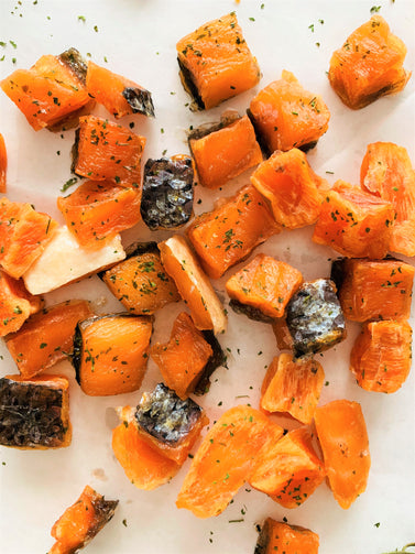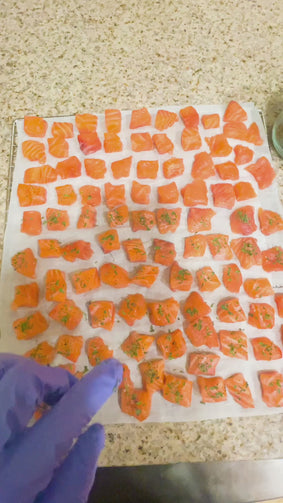 Our Salmon Bites are made with 100% Real Salmon.ย They are dehydrated over 10 hours to become a perfect chewy texture.ย No artificial flavors, additives, preservatives, or sugars. ๐ This bite will be your dog's forever favorite treat! ๐