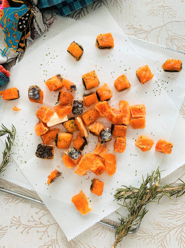 Salmon is an excellent source of protein and omega-3 fatty acids. ๐ย It helps improve our dog's skin and coat, and brain health, and reduces inflammation of the joints. If your dog is allergic to more common sources of protein, like chicken, salmon may be a good alternative!ย Our Salmon Bites are topped with parsley which will help to improve the dog's bad breath. ๐